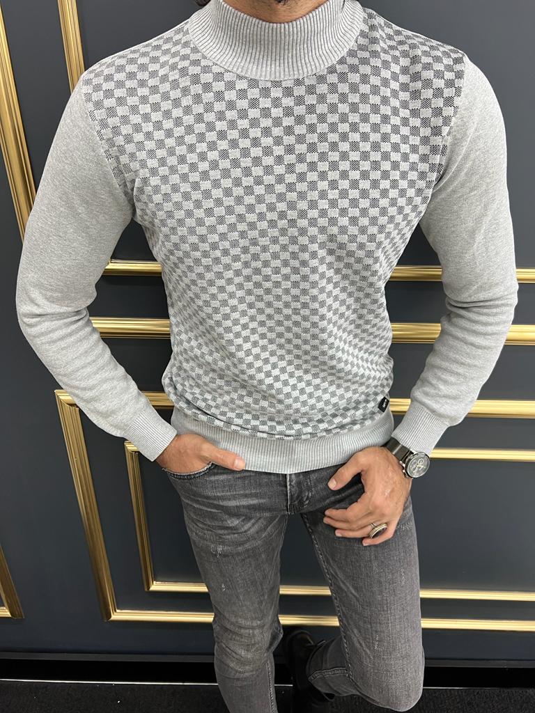 Thread Slim Fit Custom Design Half Collared Textured Plaid Grey Turtleneck