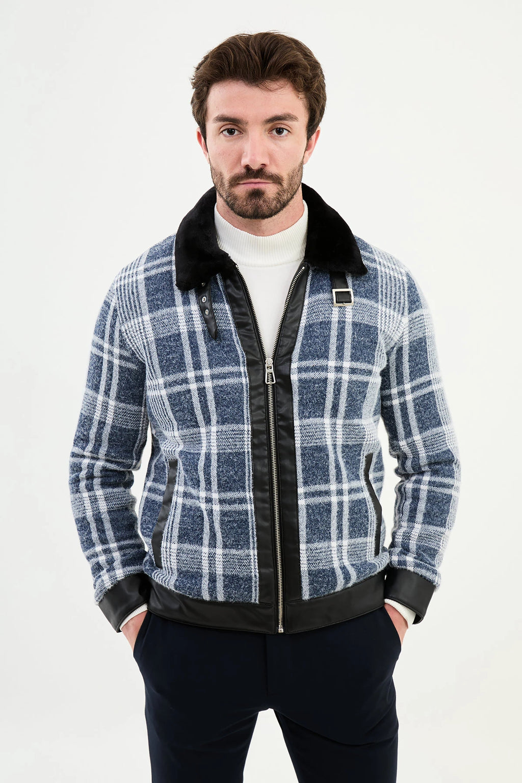 Bojoni Capena Blue Fur Plaid Slim Fit Coat